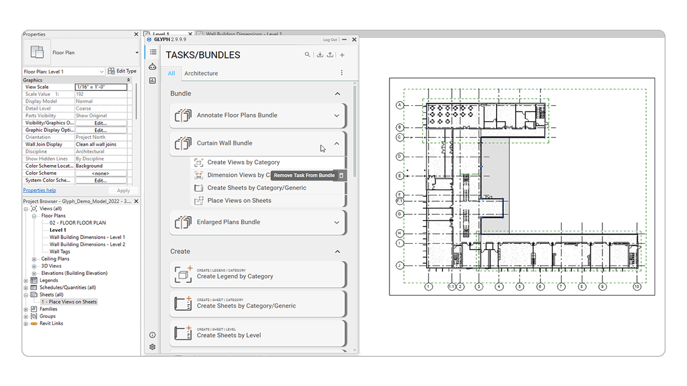 Glyph ช่วยให้คุณสามารถรวมงานหลายอย่าง (เช่น การสร้างมุมมอง + การสร้างแผ่นงาน + การติดแท็ก + การกำหนดขนาด) เข้าไว้ใน "ชุดงาน" เดียว ซึ่งคุณสามารถเรียกใช้งานได้ด้วยการคลิกเพียงครั้งเดียว และนำการตั้งค่าไปใช้ซ้ำหรือแชร์ระหว่างโครงการต่างๆ ได้